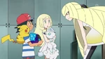 Samson is glad the class found out what Nebby would like to eat. Kukui reminds Ash they have to buy that candy, which Sophocles promises to show the market where he buys the candy from. Professor Burnet has found traces of Ultra energy. However, she and Lusamine see the location on Melemele Island, where they fly by helicopter, accompanied by the lady and Faba. After waving goodbye to Sophocles, both Ash and Lillie go to Professor Kukui's house by limousine. There, they find Kukui, alongside a helicopter. He informs them that someone is waiting for them. Inside, Lillie confronts Lusamine, her mother, which shocks Ash. Lusamine asks if Lillie behaved herself while she was absent, and tries to give her a hug. Lillie dodges Lusamine, as she is embarrassed by her mother's behavior. Lusamine claims she could remember the other day Lillie was just a baby, but Lillie claims that was a long time ago. Lusamine notices Lillie holds Snowy in her hands, as she can touch Pokémon.