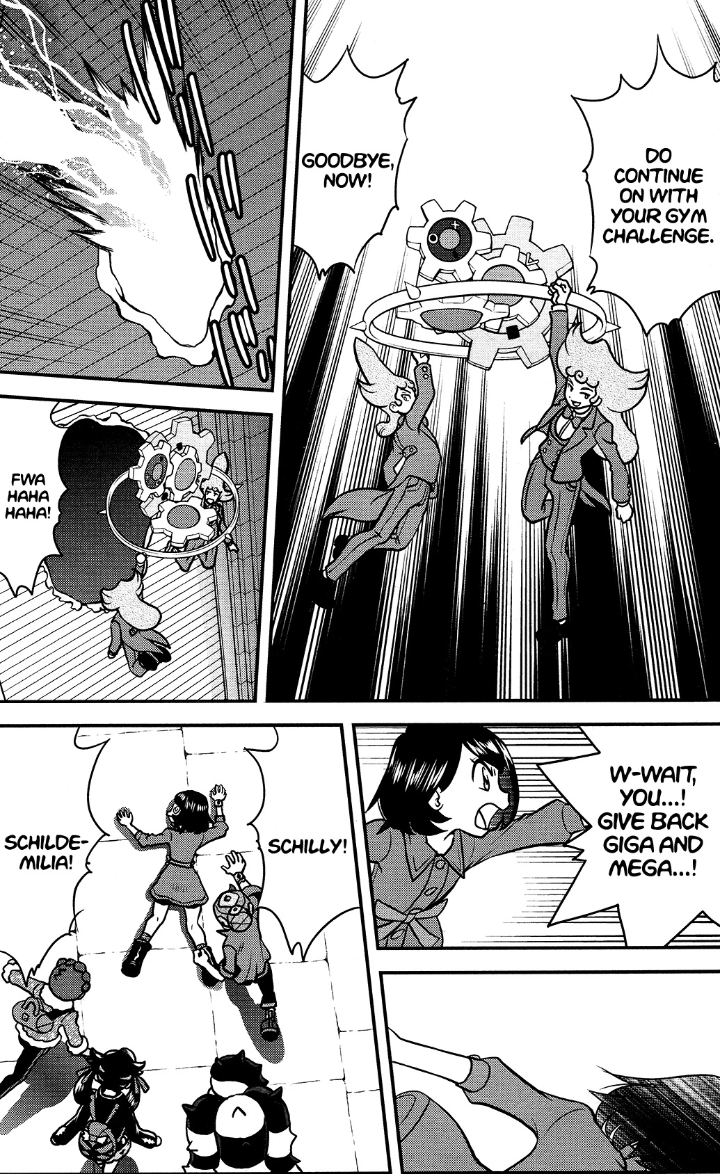 The two men fly away, announcing the start of their plans. While the group, joined by Hop and Marnie, discuss about the recent events, Sonia wakes up in a hospital. She is greeted by Leon, her childhood friend, whom she explains to why she quit the Gym Challenge.