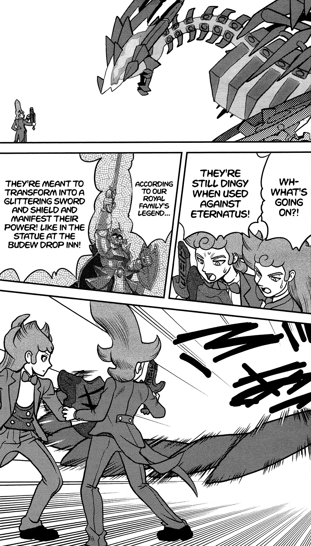 Near the top of the power plant, Rose, who is watching the battle, receives a call from Oleana. The latter explains that, while the number of Galar particles is increasing, they still don't have enough. They don't know the cause of this, and she receives reports it will take three to five times longer than they have originally planned to get the desired amount. Rose asks about other reports, to which Oleana states how the Darkest Day is different than what the tapestries have depicted it, noting it must've been a simple depiction of the event. Oleana wonders if Eternatus will evolve so they could receive the necessary amount of energy. Rose thanks Oleana and ends the call. He then turns to Sordward and Shielbert, stating that Eternatus hasn't gotten serious about battling. The duo is angry at Rose looking down at them, and declare that they, as true celebrities, will end the Darkest Day. The two show the Rusted Sword and Shield to Eternatus, who becomes still. The duo laughs, exclaiming that they will bring judgement upon Eternatus by using these artifacts.