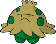 Shroomish is a mushroom-like creature. It is mainly brown above its waist, apart from a few large green spots, and a green underbelly with two round feet. Its waist appears to be flared similar to a skirt. It has a heavy unibrow, a triangular mouth and always seems to be angry.