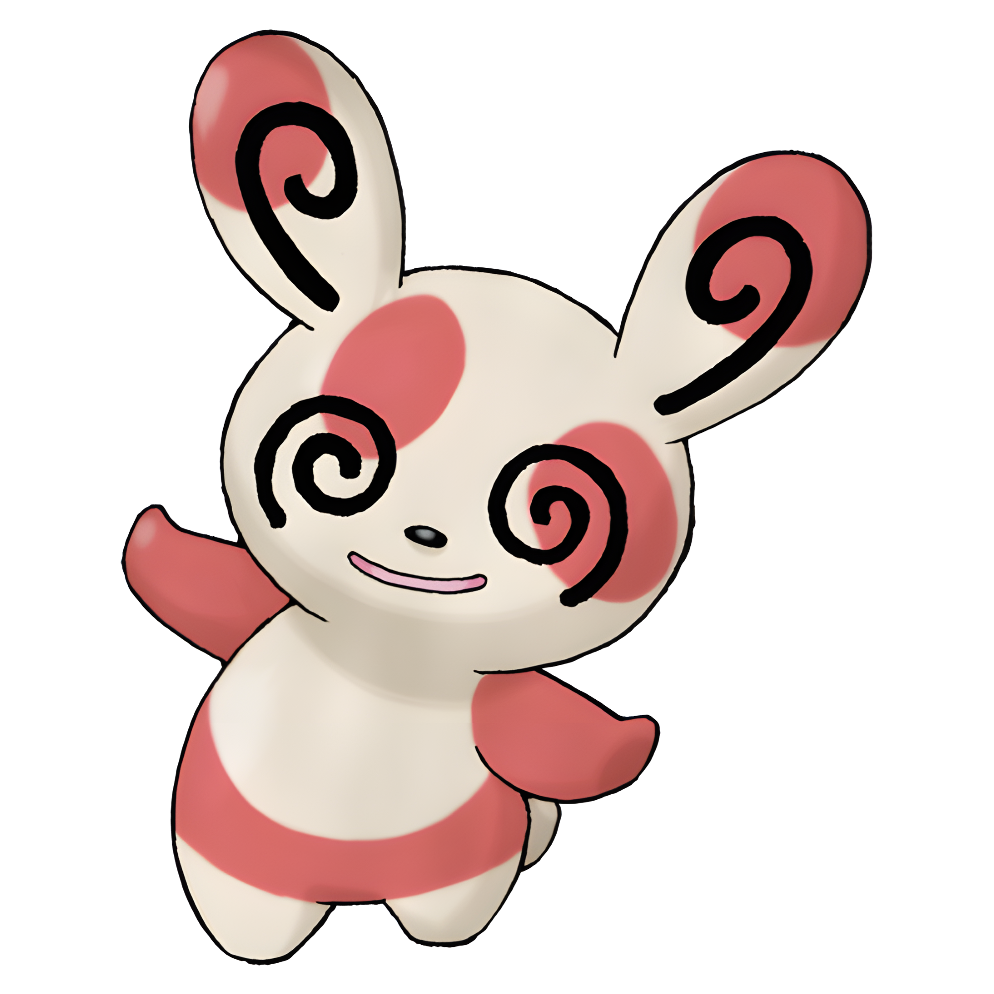 Spinda is a Panda Pokémon with many different spot combinations. It has swirls for eyes that spiral in different directions. While Spinda's body has a combination of four different red blotches and a cream coat, its nose and mouth always appear the same. The nose always is an elongated oval shape right above its mouth while the mouth itself is always open.