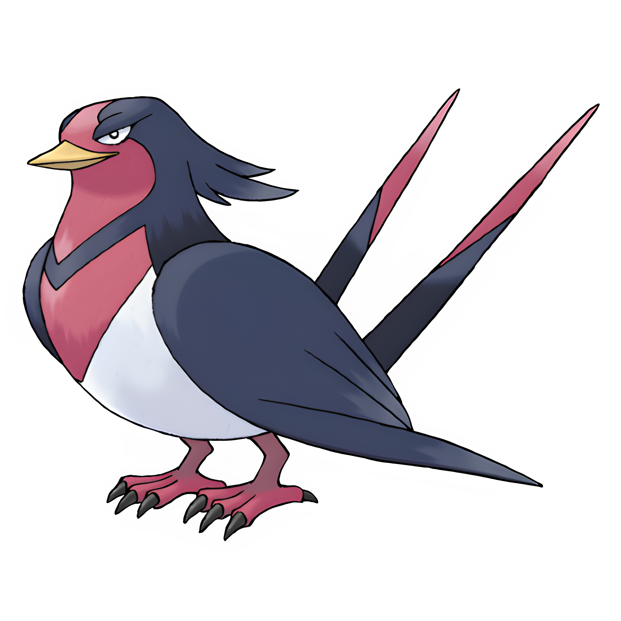 Swallow is a large, navy blue, swallow-like Pokémon with a somewhat chubby white underbelly and a red breast and face. Its tail is deeply forked, it has a crest of feathers on the back of its head, and it appears to have a smug expression.