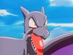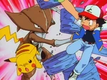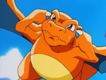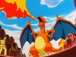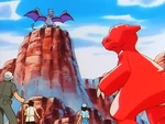 Meanwhile, Geodude has finally found a hole leading into the cave. A crowd has come to help dig for Ash and Team Rocket. Suddenly, the Aerodactyl flies up out of the hole with Ash in its grasp. Charmeleon wants to battle Aerodactyl, and shows a scratch Aerodactyl made on his forehead, but the Pokémon taunts Charmeleon. Upset for being taunted, Charmeleon angrily stomped its feet and roars, evolving as everyone watches before Charizard is finally revealed. Unleashing its Flamethrower, Charizard takes flight and chases Aerodactyl. Charizard uses Flamethrower on Aerodactyl, but misses. Ash feels that Charizard does still care about him, but when its Flamethrower accidentally burns Ash, he realizes that Charmeleon had only evolved to fight Aerodactyl for his own pride.