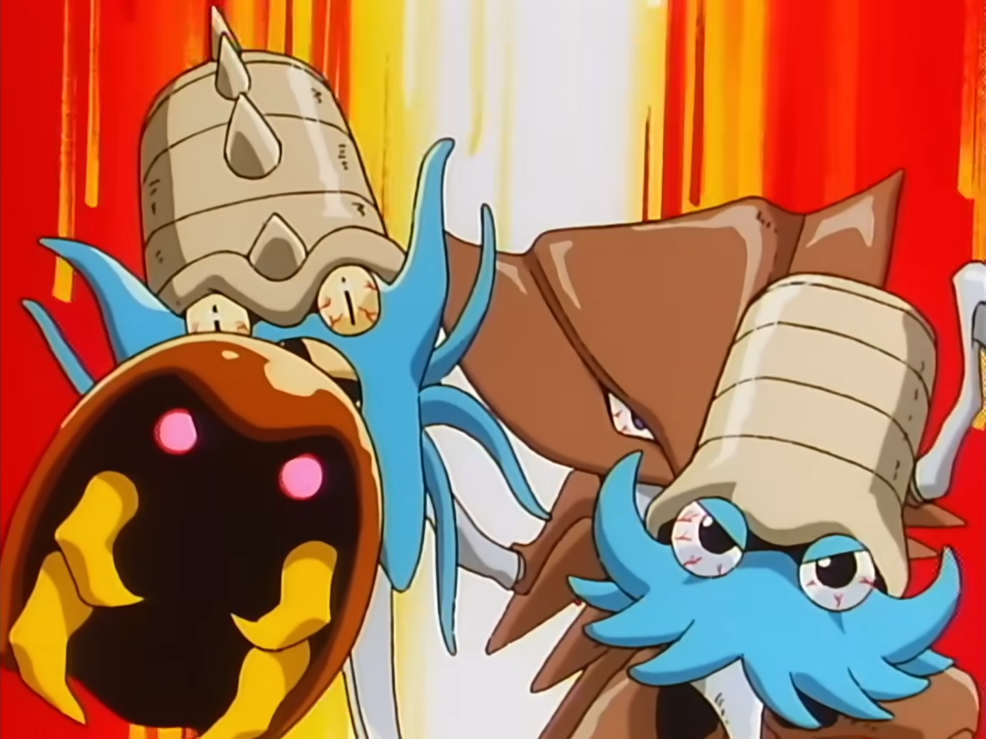 - When the camera pans over all of the fossil Pokémon to show their red eyes, one Kabuto is depicted with the colors of its claws and shell swapped.