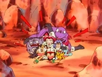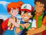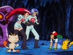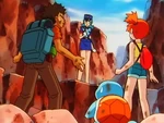 Meanwhile, Team Rocket plants bombs in the canyon so they can find fossils quicker. Ash notices this just as Meowth lights the fuse. Ash and Squirtle chase it trying to put out the fuse. It gets to the end and Pikachu shoots an electric beam at it in panic. The blast goes off and Ash, Team Rocket, and Pikachu find themselves underground. Squirtle is the only one who escapes quickly enough. Misty and Brock hear the explosion and they run over to it and they find Squirtle. Misty, Brock, and Squirtle quickly start digging to find Ash and Team Rocket.