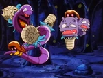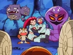Meanwhile, still stuck with the prehistoric Pokémon, Team Rocket try to find a way to escape them, only for James to sneeze, waking them up again.