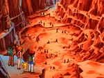 Our heroes approach Grampa Canyon, famous for the beautiful scenery of its valley. As they approach, however, they find wave upon wave of people also heading for Grampa Canyon. Carrying backpacks, pickaxes, etc. they are all dressed like explorers. Ash has no idea what is so special about the canyon, but he notices a familiar face among the crowd—that of his rival, Gary. According to Gary, fossils from an extinct Pokémon have been discovered, triggering an ancient Pokémon excavation boom.[1]