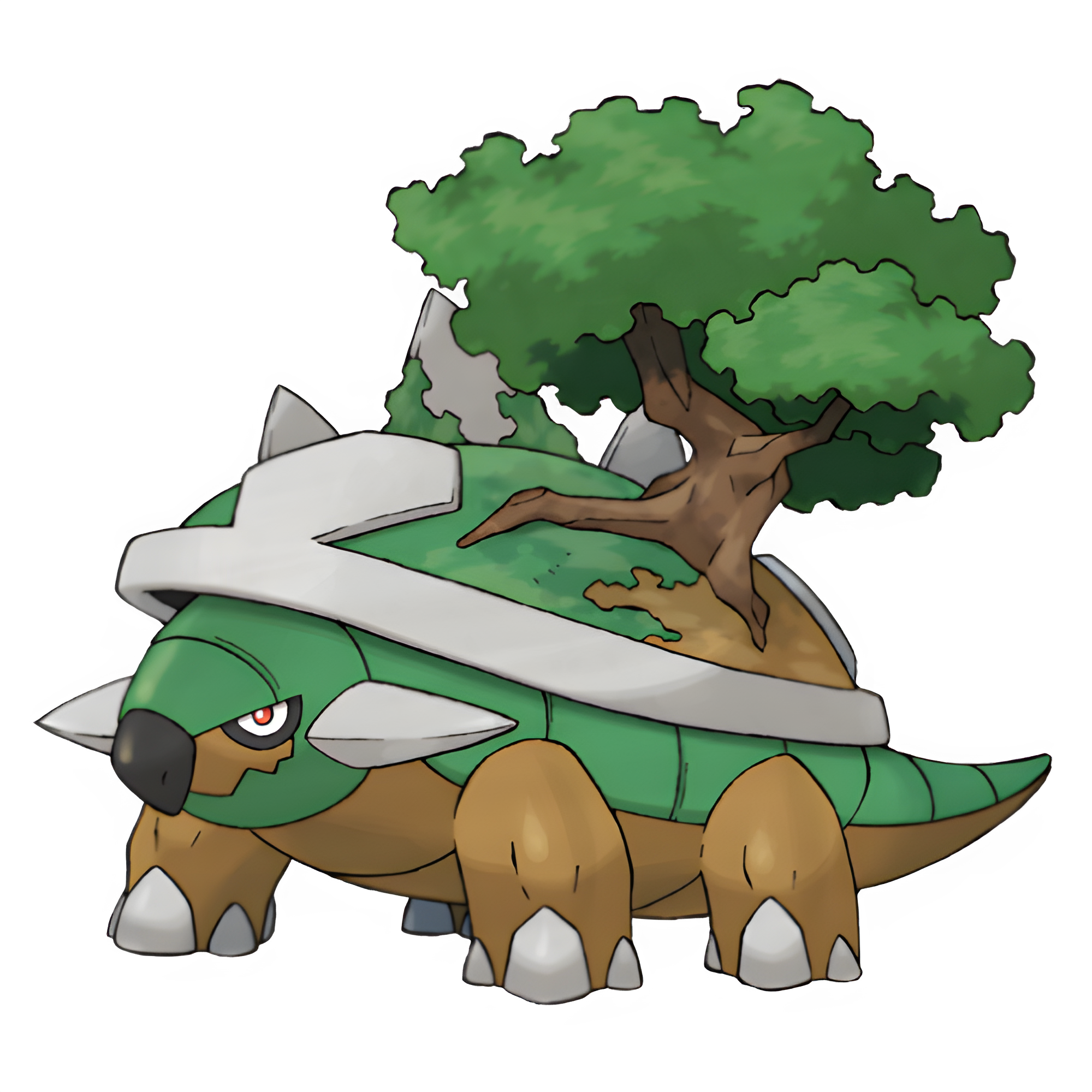 Torterra is a large Pokémon that resembles a cross between an ankylosaur and a tortoise. It has a dark-green shell on its back with a white rim and diamond shape, along with a large tree on top. Three spiked rocks also line its back, and part of its shell appears to be covered in dirt. Torterra's body is mostly dark-green above the midsection, but underneath, its body is brown. To keep its balance and support its weight, it has a short, pointed tail and muscular legs tipped with rock-like nails. Torterra also has two silver spikes on both sides of its head, red eyes, and a black, kite-shaped beak.