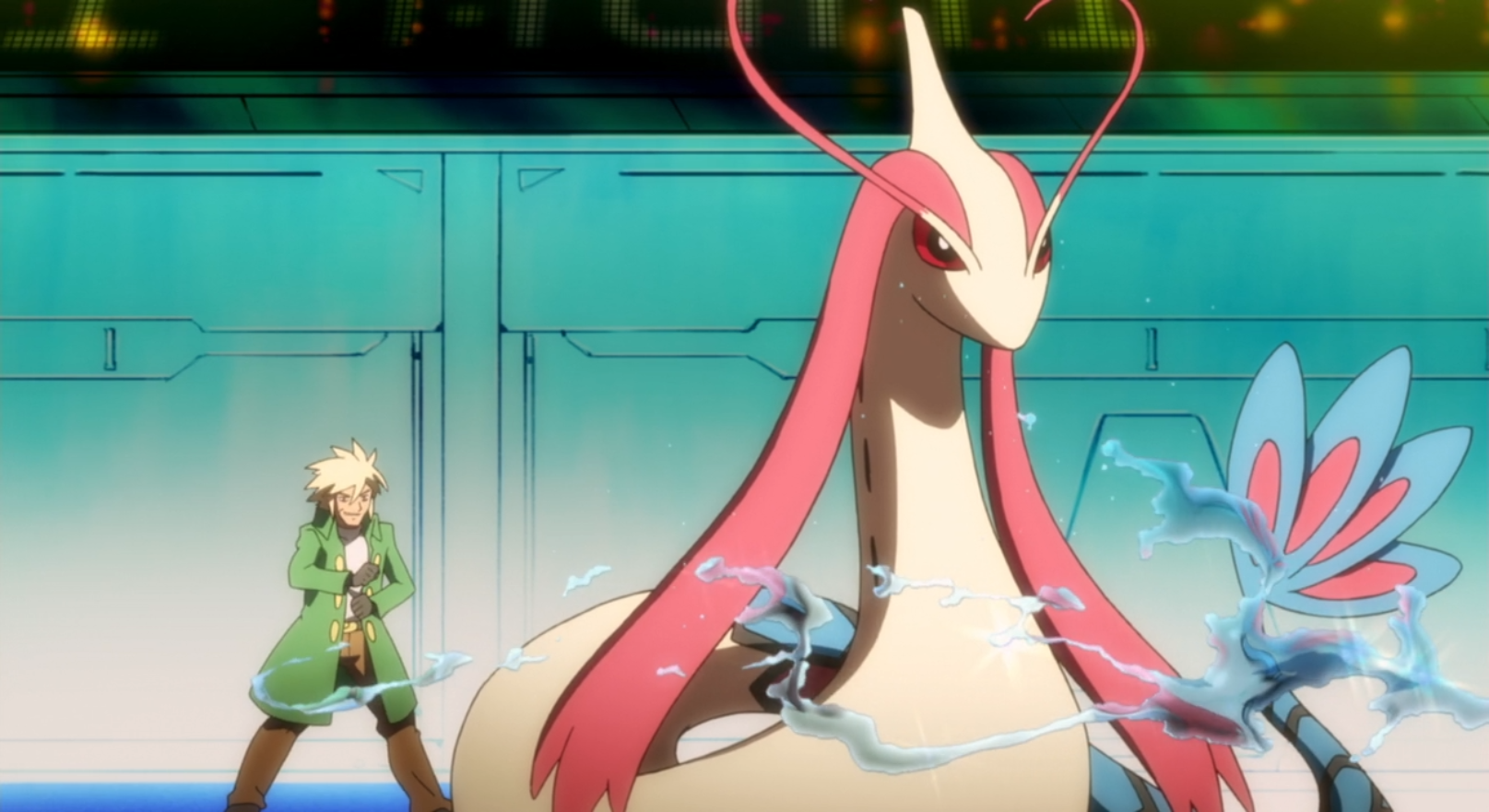 Cynthia and Garchomp were seen battling Palmer and his Milotic.[3]