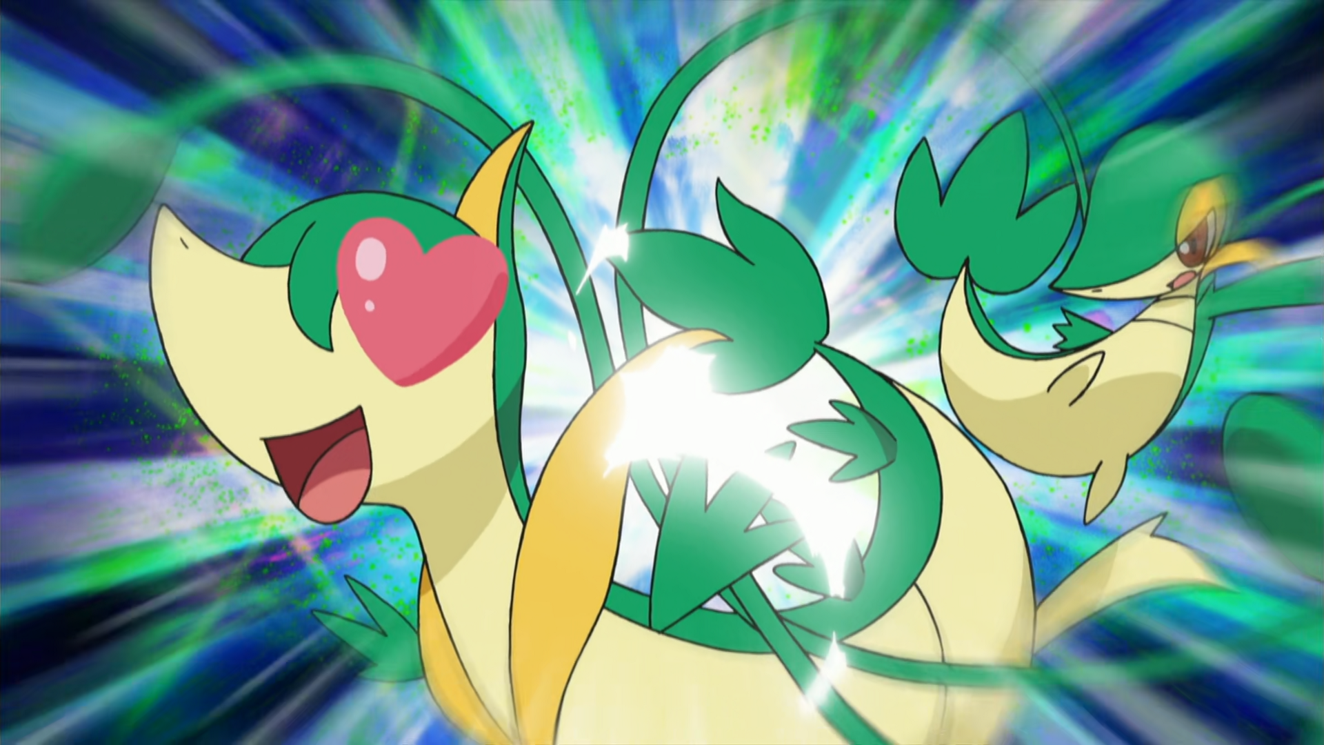 Ash's Snivy hits Serperior as Servine, who is infatuated, with Vine Whip.