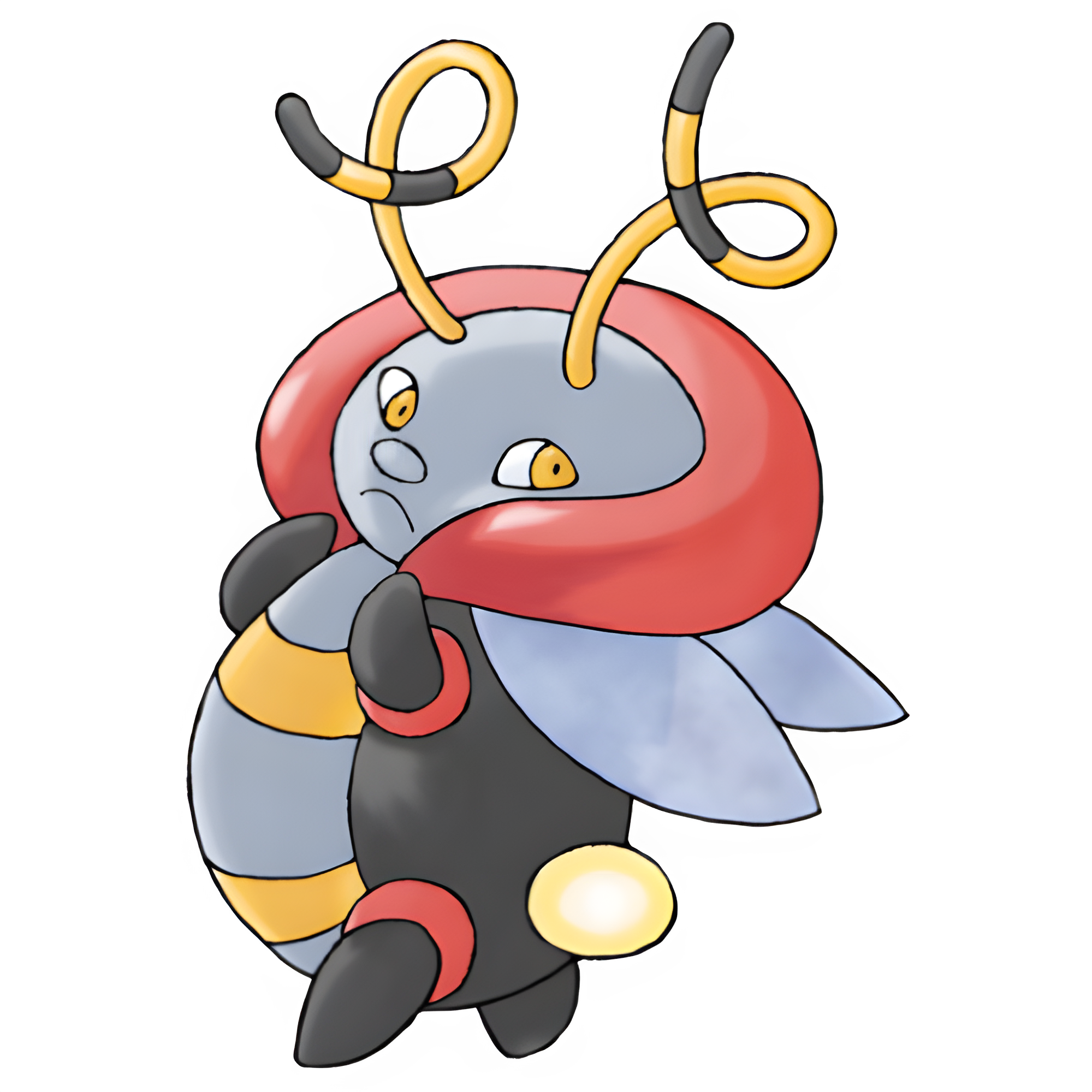 Volbeat is a firefly-like, bipedal Pokémon. Its body is black with a blue chest and abdomen. There are two yellow stripes across its front: one on its chest and one near its legs. A red band separates each limb from its body and a thicker, incomplete one surrounds its shoulders. Two simple wings extend from the band around its shoulder. It has a blue face with yellow eyes, and curly, yellow antennae with black stripes. It has a spherical yellow tail, which glows to communicate and draw geometric patterns in the sky while in a swarm.