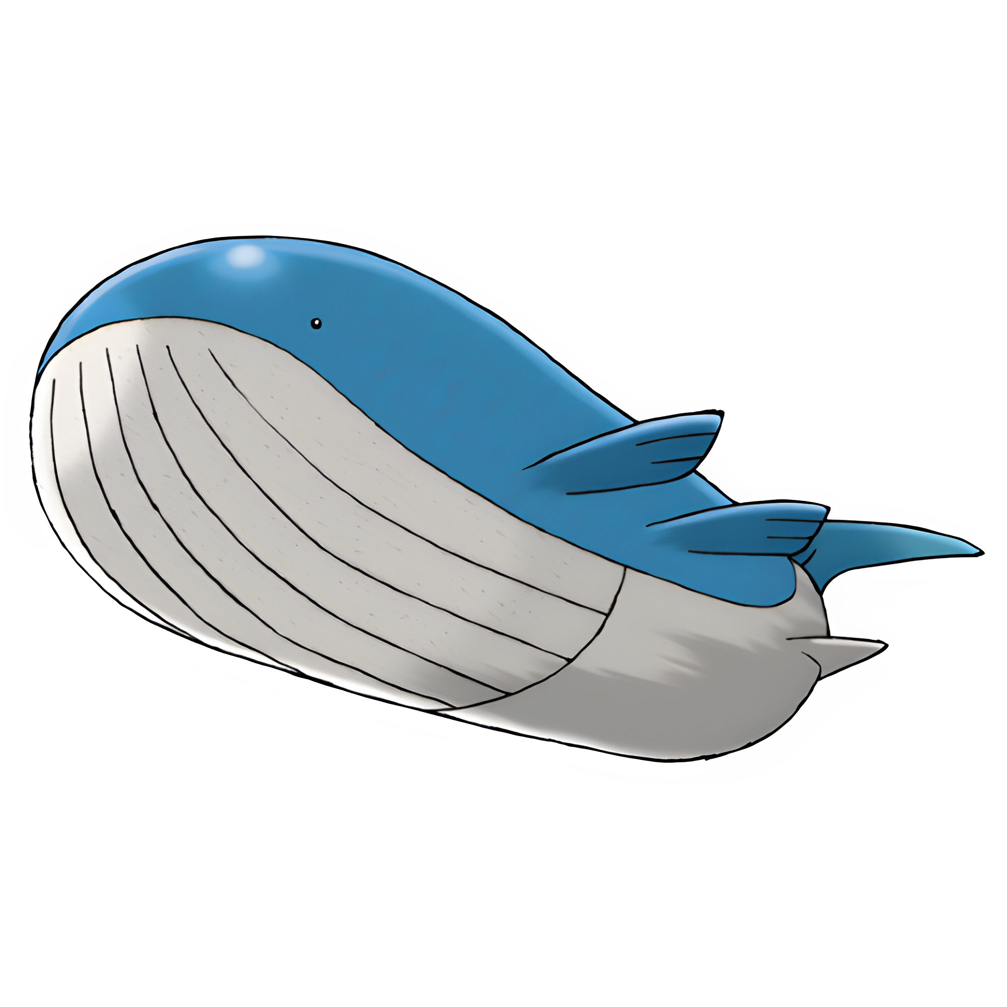 Wailord is a colossal, blue, whale-like Pokémon with small black eyes and a wide mouth filled with baleen-like teeth. It has a round, blimp-like body with two pairs of fins on either side and a small crescent-shaped tail fluke. Its underbelly is cream with vertical stripes running through it, while its back as a series of small white spots running down its length. Wailord is the second largest Pokémon after Eternatus.