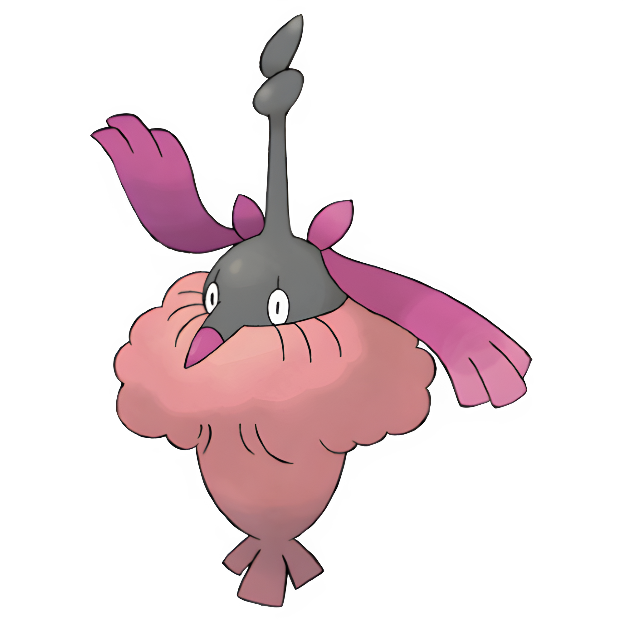 Wormadam is a black, bagworm-like Pokémon with a coat of leaves, sand, or building insulation that has fused with its body. It has oval eyes, a long pointed beak, and a long antenna with a coiled tip. The beak is tipped with varying colors depending on the coat. The coat forms a pair of arm-like structures near this Pokémon's head. The Plant Cloak form has several white flowers covering it and gives Wormadam a green-tipped beak and large leaves for arms. It will be dotted with reddish-brown rocks, and have chains of pebbles for arms and a brown tipped beak if it has the Sandy Cloak. When covered by the Trash Cloak, it has a pink-tipped beak and long, dark pink ribbons for arms.