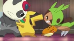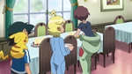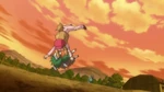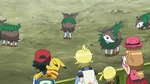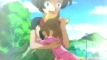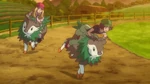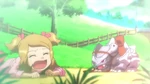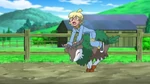 As Ash rides Skiddo, Bonnie gives Dedenne to Serena to watch before riding Skiddo. Bonnie mounts on Skiddo, while Grace warns her she must not raise her voice, else Skiddo will be startled. Bonnie remembers that and bonds with Skiddo, then rides it. Serena, however, remembers she was too afraid to ride a Skiddo when she was little, though her mother was there. Seeing Bonnie ride, Grace thinks she may become a Rhyhorn racer one day. Clemont, however, has trouble riding Skiddo and is thrown on the ground. Serena's mom reminds him Skiddo can sense his fear, but Clemont does not see how he will be able to. Ash thinks Clemont will ride it eventually. However, Clemont gives up and Bonnie chides him. Clemont simply replies everyone has strengths and weaknesses.