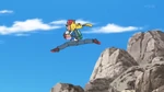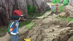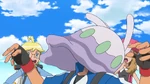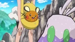 As our heroes make their way up a rocky hill, an unconscious Goomy falls out of the sky, right onto Ash’s head! Clemont figures out that Goomy isn’t feeling well because it’s dehydrated, so Ash braves a steep climb to get it to the nearby river. But as soon as it’s restored to health, Team Rocket swoops in to grab Pikachu, and Goomy ends up in their cage as well!