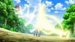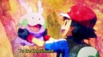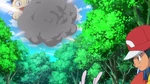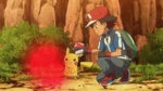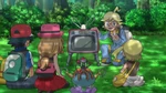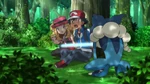 Goomy begins to sweat a lot from fear. Ash wonders why it is scared, so Clemont presents his latest invention: the Pokémon Thought Translator. He places the visualizer on Goomy's head and the gang looks into Goomy's past: They discover it fled on Swanna after its home was attacked by swarms of Bug-type Pokémon including Yanmega, Ariados and Pinsir. The device stops working and Clemont tries to fix it which causes it to explode. He deduces Goomy was in the middle of the battle and got scared by Ariados. Goomy confirms that, chewing Clemont's ear. Serena deduces that this is why Goomy is scared of Ariados, with her ear also being chewed on. Suddenly, a device cuffs the heroes to a tree, as Team Rocket appears. Meowth releases a net: Pikachu tries to electrocute it but the net is electric-proof and catches him and Goomy. James throws a smokebomb and the crooks make their getaway. Ash calls out Frogadier who cuts the cuff, freeing them. Ash then sends out Fletchinder to search for Team Rocket.