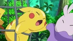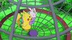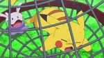 Pikachu uses Thunderbolt to no effect, as the net is electric-proof. Team Rocket notices they also caught Goomy by accident, but they allow it to stay. Still, they are pleased they caught Pikachu and have a party first, making impressions to amuse each other. Pikachu fails to electrocute the cage, so tries to tackle it. Goomy is uncertain, but Pikachu continues to hit the cage, managing to make a slight dent. Goomy gets out with Pikachu's help. However Pikachu cannot fit through the gap, so Goomy lubricates him using the slime on its body. Team Rocket comes, hearing some noise. They see Pikachu looking reflective, but ignore it and continue on. Goomy and Pikachu manage to escape. They flee. Meanwhile, Team Rocket admits Pikachu was quite oiled. Jessie and James think it wanted to get out and laugh, but their laughter fades however when they realize the possibility of this. They return to the cage, find it empty, and give chase.