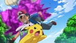James chases them on foot while Jessie and Meowth go in the balloon. As James tries to get them, Fletchinder sees them and reports to Ash, then leads the gang to where they are. James runs faster and is about to catch up before Goomy uses Rain Dance, which causes him to slip off. He boards the balloon, while Jessie sends Pumpkaboo, who uses Shadow Ball on them. Ash arrives and takes the hit for them in the nick of time. Jessie throws another device, which cuffs Clemont, Bonnie and Serena, who lament falling for the same trick twice. Meowth releases another net, but Pikachu destroys it with Iron Tail. James sends Inkay, who goes to Tackle, while Pumpkaboo uses Shadow Ball. Fletchinder uses Peck on Inkay, stopping its attack while Shadow Ball is countered by Pikachu's Electro Ball.