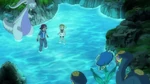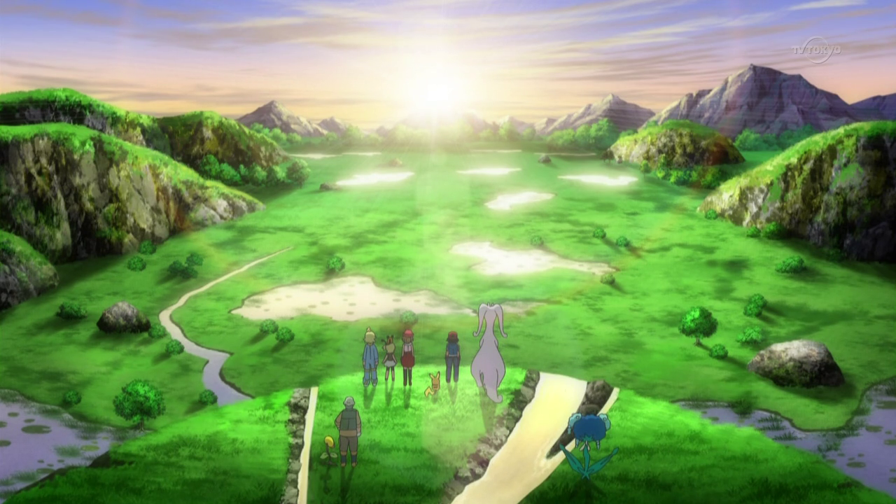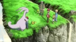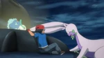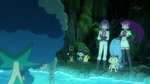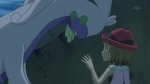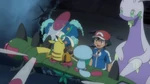 Beedrill try to save them, but they are too heavy. Wooper, Gulpin, Lotad and Quagsire use Water Gun to save them and succeed. Serena, Clemont and Bonnie are happy Ash is saved, while Pinsir gives Floette to Florges back. Keanan analyzes the ground is too dried out and the lack of water will cause this land to wither away. Goodra, however, uses Rain Dance to refresh the swamp. Florges also lends her power, using Grassy Terrain to heal the plants. Back in the cave, Florges places Floette into the water. Floette is healed and wakes up. Floette is happy and takes Florges' and Goodra's hands, bonding them together. Everyone watches this happy moment, though Ash is troubled. Outside, Ash thinks Goodra will be better off here. His friends are shocked, seeing this is his goodbye.