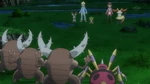 Pikachu, Dedenne and Wooper, who are trapped in cases, watch as Florges tends over Floette, but it cannot heal Floette, for there is not much water. Team Rocket lies about Goodra caused all of this and wants Florges to go back on the battle field. Team Rocket continues lying they are Florges' allies and will do anything to protect Floette. Keanan sees the water levels are going lower and lower, so he goes with Bellsprout to confirm this incident. The heroes and Goodra stand before Pinsir, Beedrill, Yanmega and Ariados. They claim they are manipulated by Team Rocket and they are not here to fight, but since they don't listen to anyone besides Florges, the Bug army attacks. Left with no other choice, Clemont sends Bunnelby and Chespin to use Vine Whip and Mud Shot, while Serena sends Braixen to use Flamethrower. As the army is distracted, Ash, Goodra and Bonnie pass by, letting Serena and Clemont fight them.