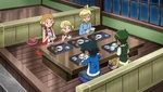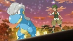 Ash is so excited for his Gym battle the next day that he can barely wait to finish dinner before launching right into some special training with Sawyer’s help. Ash isn’t the only eager one—Serena, Clemont, and Bonnie rush through their own meals to cheer them on![1]