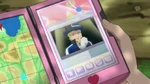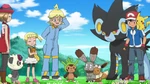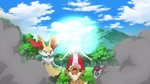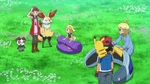 Since they don't know where Eevee is, Clemont fixes his eyeglasses, presenting the new technological wonder. He explains the machine can detect living beings and has fixed errors, since Clemont used the machine to find Bonnie some time ago. He activates the machine, which points at a Vivillon. Clemont activates the machine again, which detects a Budew. Clemont becomes frustrated, causing the machine to malfunction, descend down and explode, leaving the heroes with bad hair and Clemont disheartened. Instead, the heroes split up to find the Eevee the conventional way. Serena sends Pancham and Braixen off and continues searching. Eevee, on the tree, yells out a cry, stopping Serena, who would've fallen off a cliff. Serena is shocked and goes to thank Eevee for warning her, but Eevee is too shy and leaps off. Serena, as a token of gratitude, leaves her flower circlet on a rock and goes away with Pancham and Braixen.