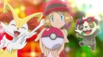 Serena, Braixen and Pancham stand on a rock, as they want to show Eevee their performance, to show they also have fun while dancing. Braixen uses Flamethrower in the sky, gaining Eevee's attention, who watches from a rock. Pancham jumps and uses Dark Pulse on the Flamethrower, creating a powerful image and releasing glitter all over. Bonnie, Ash and Clemont praise Serena's performance, while Serena wonders what Eevee thinks of that. Eevee is still shy, but listens to Serena. Serena explains she, Braixen and Pancham enter Showcases, which are a lot of fun. Serena asks Eevee would she like to come with them, as her (Eevee's) talented dancing would impress many people. Eevee is uncertain and thinks a bit, but is captured by Team Rocket in a net. The heroes demands Eevee free, but Jessie considers Eevee a Pokémon for her showbiz. Jessie sends Gourgeist and James sends Inkay. Inkay uses Psybeam, but is countered by Pikachu's Electro Ball. Gourgeist uses Shadow Ball, but the attack is blocked by Braixen's Flamethrower.