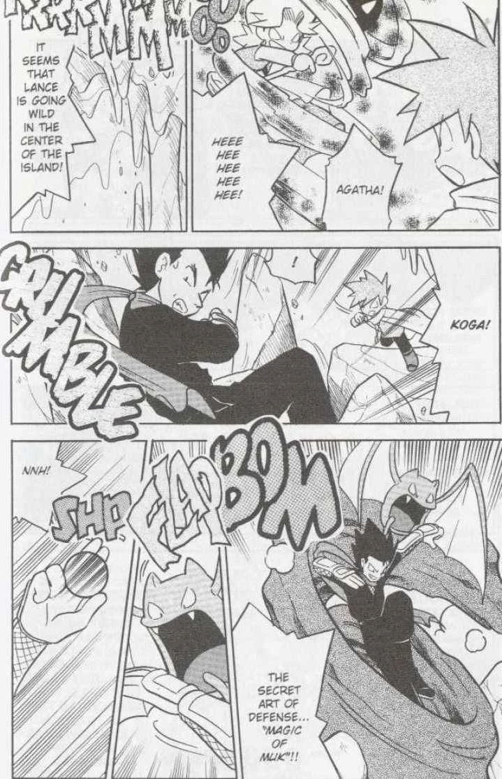 Agatha vanishes, claiming that even if this battle is ended, war has yet to finish, knowing the Elite Four's plan is nearly completed. The cave cracks, as Lance is doing a rampage outside. Agatha waves her cane, causing spikes to fall of the ceiling. Koga sends Muk, who protects him, then vanishes. Before vanishing, Agatha tells Blue one badge is missing for the plan to be completed, and an entire mainland force has been sent to get the badge. Agatha explains she used only the group leaders and ordered them simple commands, as they led the entire force to get the badges, which would be combined. She also tells she used the bands to control Pokémon, like she did with Bruno. She admits they did capture Red, mocking Blue.